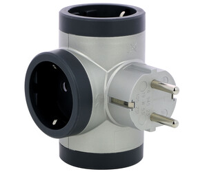 Adaptador triple 3x2P+T de entrada lateral. 16A 230V 3680W. Color aluminio y negro.
