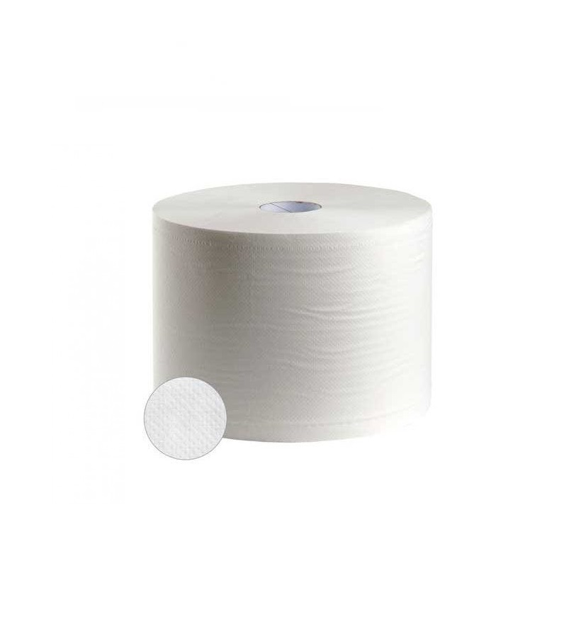 Bobina papel industrial de limpieza gofrado reciclado blanco. Doble capa. Fabricadas en bobinas para ser servida hoja a hoja por dispensadores automáticos. Gran capacidad de absorción.