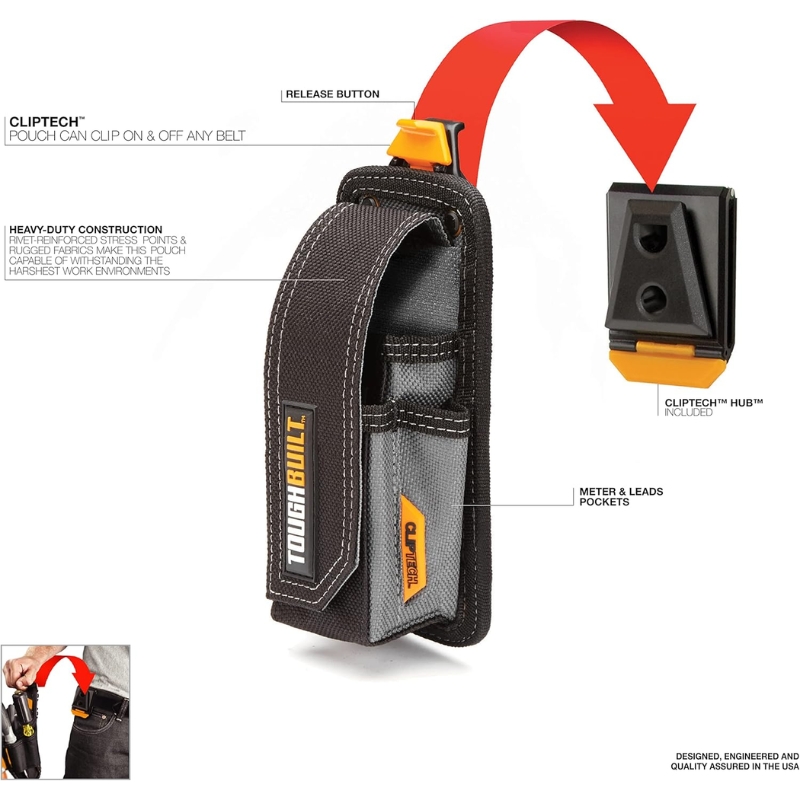 Bolsa portaherramientas ToughBuilt TB-CT-34-B, diseñada específicamente para transportar polímetros, voltímetros y accesorios eléctricos. Su sistema ClipTech™ permite fijación rápida al cinturón y mejora la organización en trabajos técnicos.