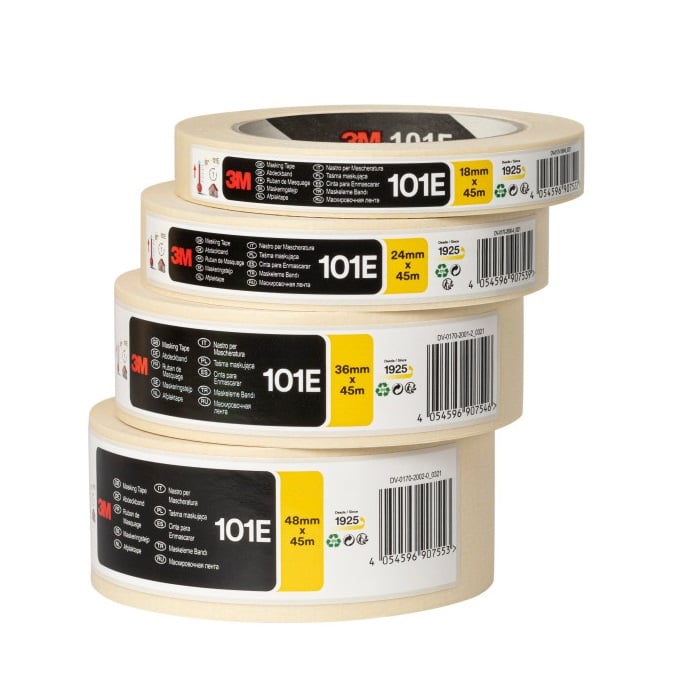La cinta de enmascarado 101E es una cinta de papel crepé suave y multiusos. Esta cinta de color beige, con adhesivo de caucho y un grosor de 0,12 mm está diseñada para uso general (sujeción temporal, enmascarado de pintura …)