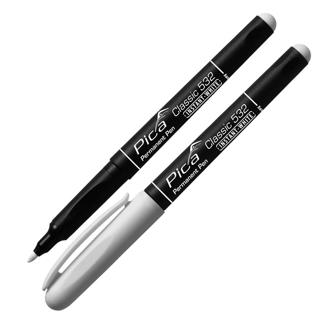 El marcador blanco permanente 532 La tinta blanca instantánea marca inmediatamente, sin agitar ni bombear. Marca en casi todas las superficies, tinta permanente a base de agua. Resistente a la intemperie y a la abrasión después de aprox. 20 segundos. Alternativa económica a los rotuladores de pintura blanca. Sin xileno ni tolueno.