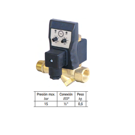 Purgador eléctrico 230V con temporizador analógico para regular el intervalo de abierto/cerrado.